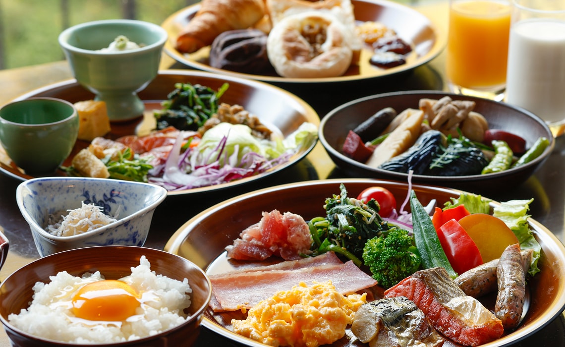 和洋のメニューが並ぶ「朝⾷ビュッフェ」をご⽤意しております。 契約農家から届く地元⽶「ひのひかり」の炊き⽴てご飯、⾝体に染み渡るお味噌汁、焼き⽴てのパンや新鮮なサラダなど。朝の光が差し込むレストランで、活⼒あふれる⼀⽇のスタートを。