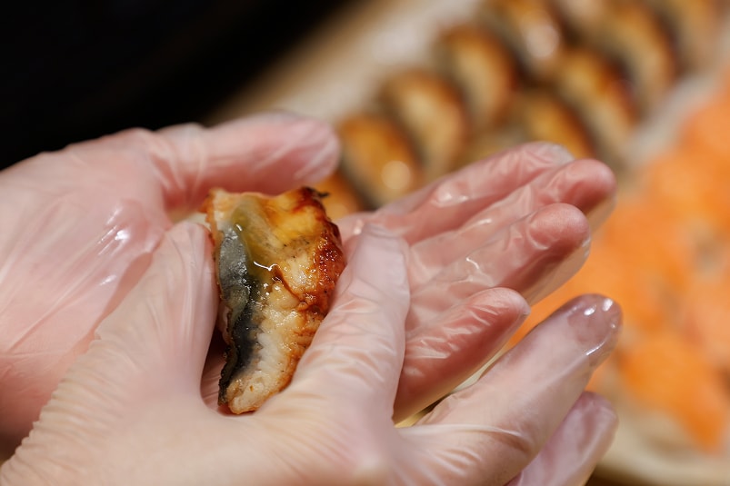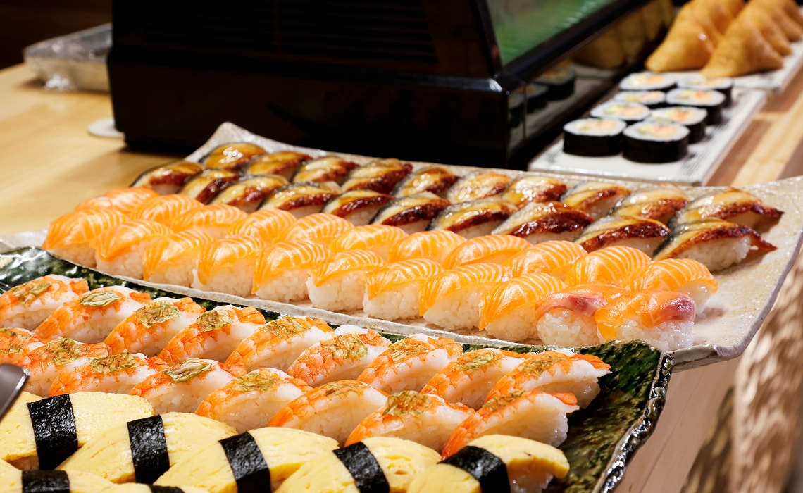 会場の⼀⾓では、料理⼈がお客様の⽬の前で腕を振るいます。じゅわっと⾳を⽴てて揚がる「天ぷら」や、その場で握る「寿司」。作り置きではなく、⼀番美味しい「出来⽴て」の瞬間を味わっていただくことこそ、私たちが考える⼀番の贅沢です。