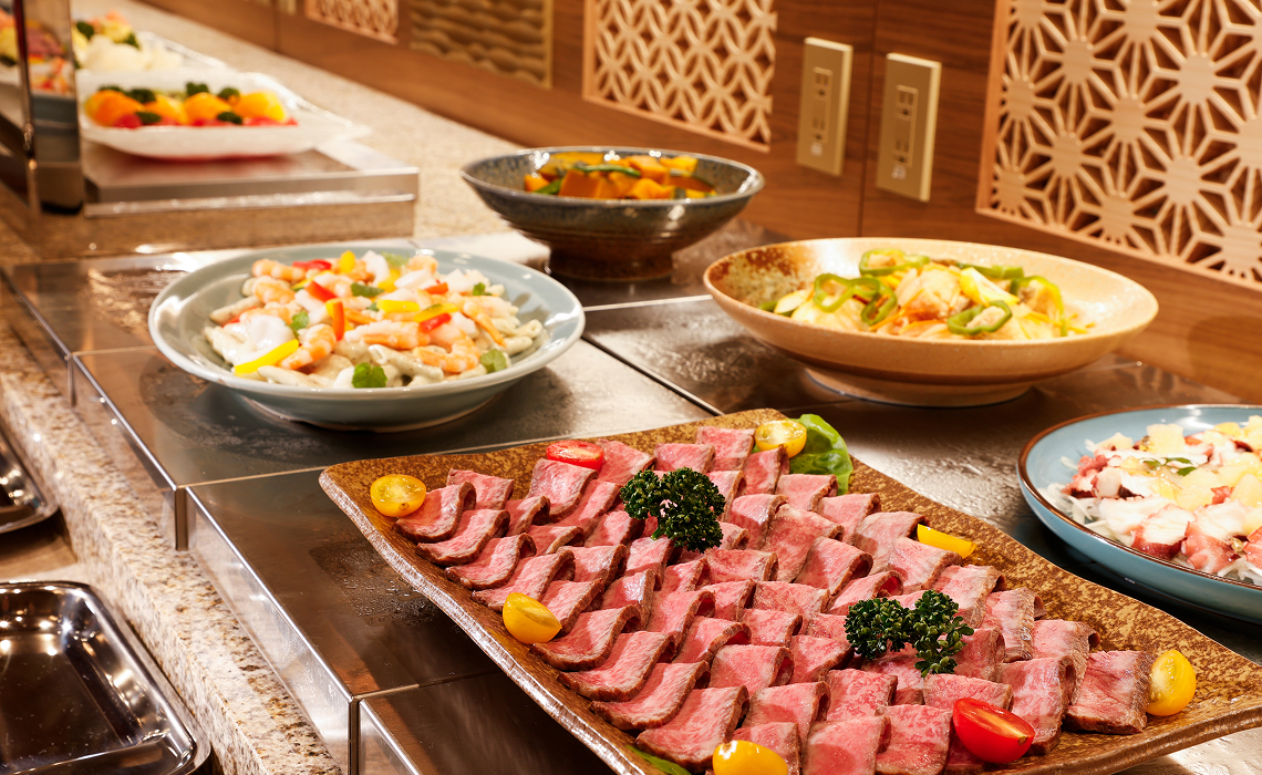 「ビュッフェの⾷事に、特別な⼀⽫を加えたい」。そんなご要望にお応えするため、神⼾ビーフのステーキや網焼きなど、こだわりの逸品料理も承っております。記念⽇や⾃分へのご褒美にぜひご賞味ください。