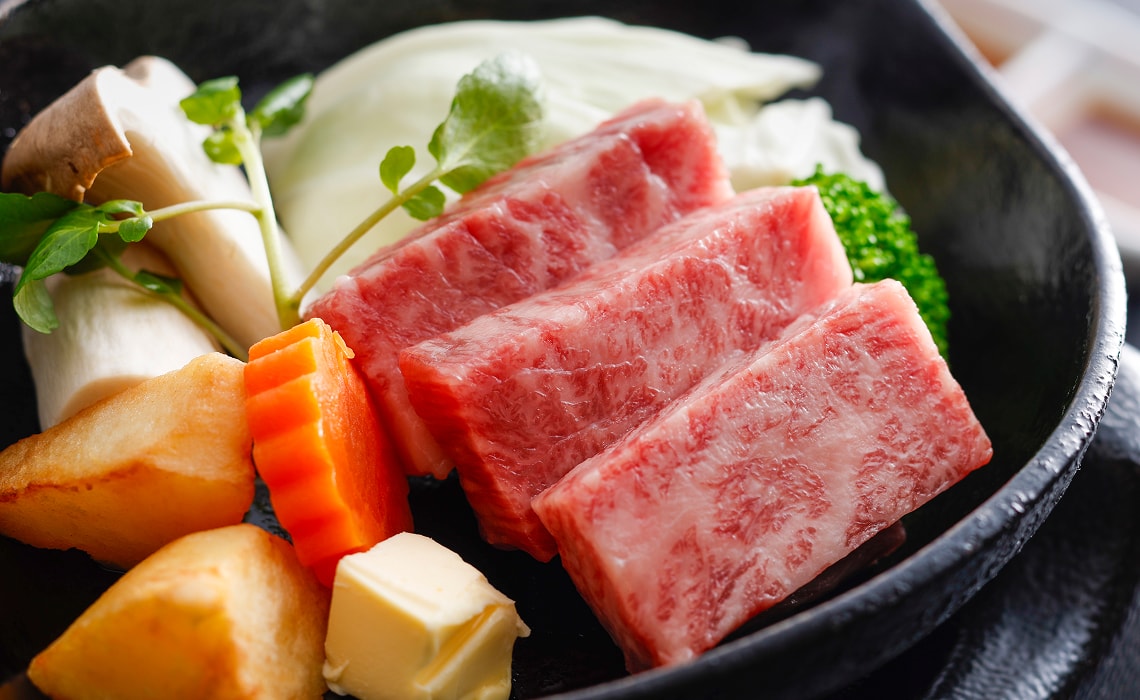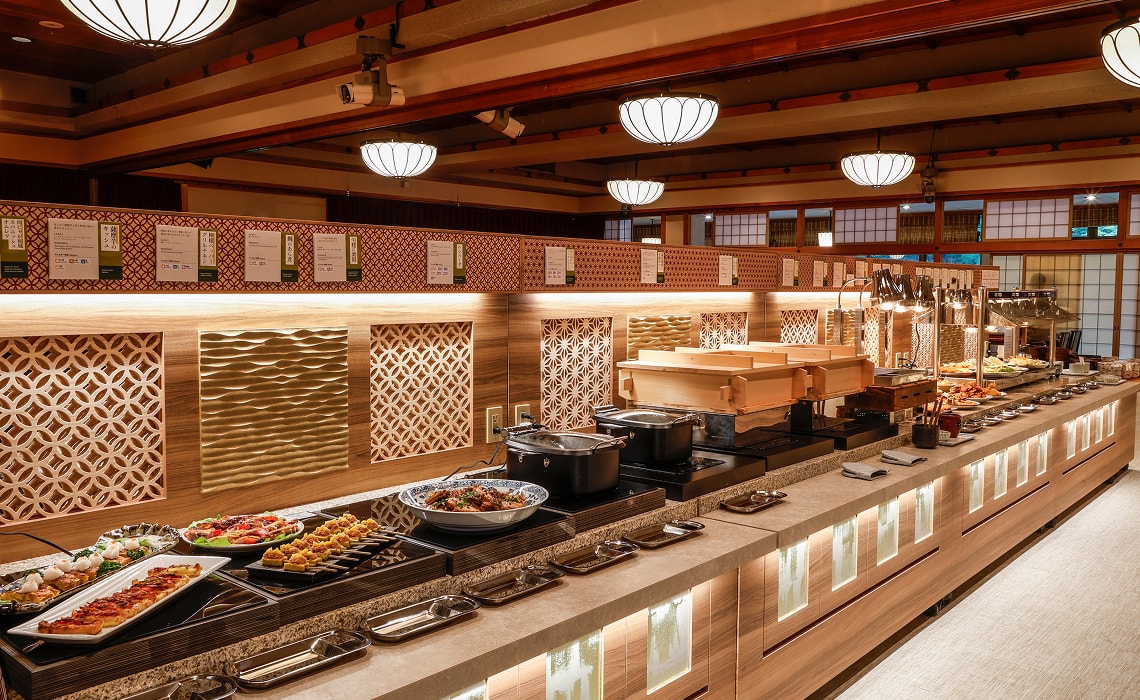 ご⼣⾷は、2025年に装いを新たにしたビュッフェレストラン「⽉の座(つきのくら)」にてご⽤意いたします。游⽉⼭荘の基本スタイルは、こだわりのメイン料理とビュッフェを組み合わせた「ハーフビュッフェ」です。彩り豊かなビュッフェに加え、お席にはこだわりのメイン料理2品(⽜⾁料理・旬のお造り)をご⽤意いたします。⿊⽑和⽜の⽵蒸しや、神⼾ビーフの鉄板焼きなど(※プランにより異なります)、⾃慢の⽜⾁料理と新鮮な⿂介を、お席でゆったりとご堪能ください。