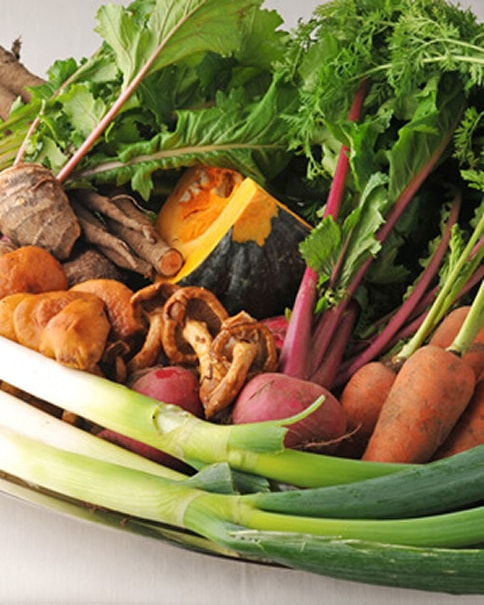 「その⼟地のものを、その季節に⾷す」。兵庫の⾃然が育んだ野菜本来の濃い味を⼤切にし、素材の味をそのまま活かした調理法でお届けします。