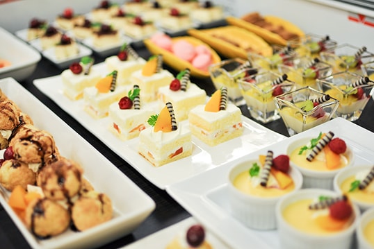 当館専属パティシエが手がけるスイーツは、女性だけでなく、お子様にも大人気!季節限定のメニューもございます。お好きな物をお好きなだけお召し上がりください。