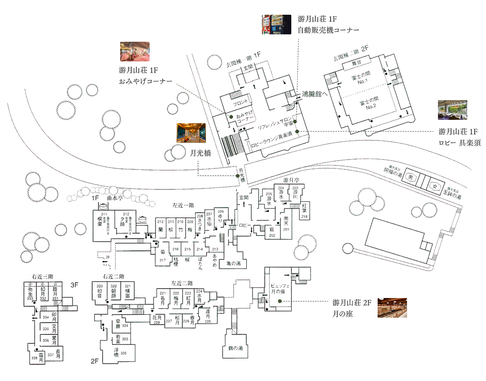 游月山荘には、くつろぎと癒しに満ちた館内施設が揃っております。贅沢な休日にそっと彩りを添え、心に残るひとときをお過ごしください。