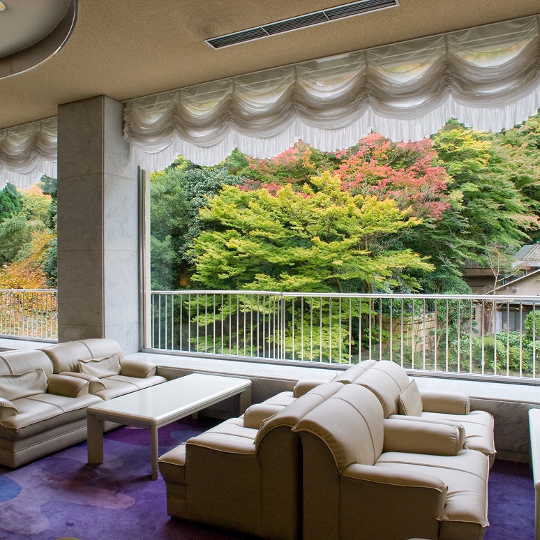 游月山荘のロビーでは、滝川の流れと、落葉山を一望でき、当館自慢のパノラマビューの景色をご堪能頂くことができます。