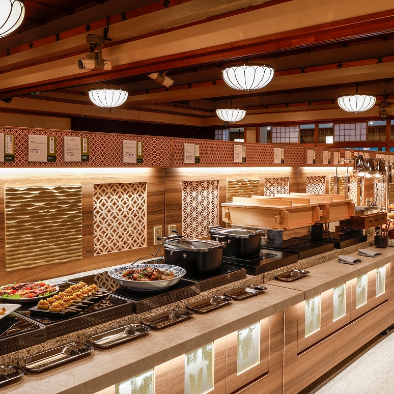 マクロビオティックの考え方を取り入れた約60種のメニューがある健康食ビュッフェレストラン「月の座」。月光園の和食職人の技術が詰め込まれたお料理の数々を是非、ご賞味下さいませ。