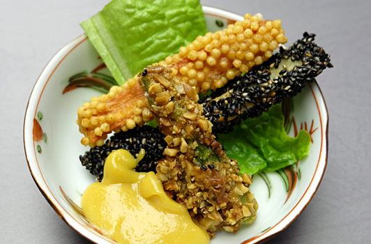 アスパラ、人参などの根菜にそれぞれ違った衣をつけた、一風変わった野菜フライでございます!