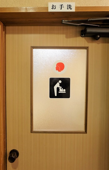お手洗いの入り口には、ベビーベッドのピクトグラムマークの表示もございます。