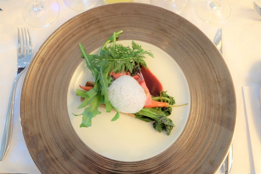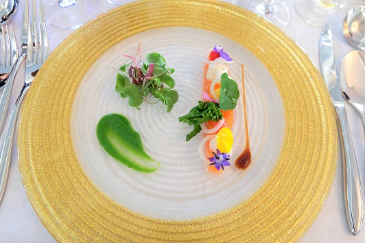 食用花や、サーモンの上に丸く形どられたお野菜が、見た目にも可愛らしい一品です。