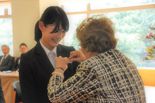 式の終わりには、女将手づから新入社員一人ひとりに、名札を付けてくださいます。