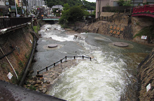 この有馬温泉も例外ではなく、河の増水が起こっている状態です。