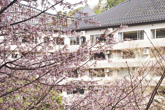 桜越しに見る鴻朧館でございます。