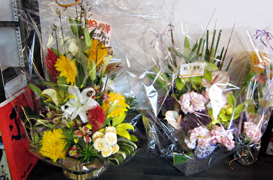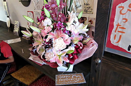 ※お店の一周年記念に立ち寄るお客様は多く、リピーターや関係者の方からの花束も飾ってありました。