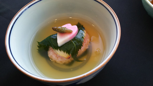 春を告げる食材のうすい豆を裏ごしたものを、魚のすり身に混ぜ込み、丸くつまんですくい取った椀種。