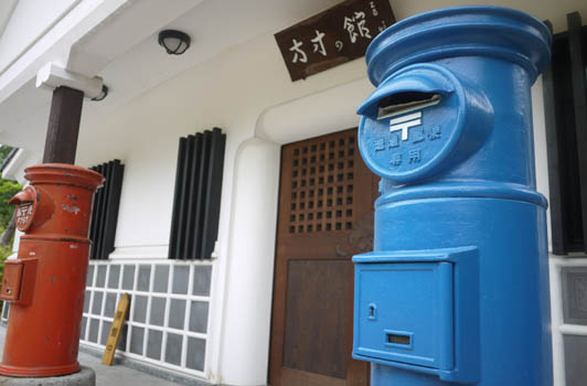 博物館の前には赤いポストと青いポスト。