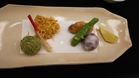 (6月から味覚を味わう先取りの鱧を刻み、湯葉をまぶして揚げたもの)