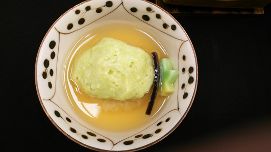 (薄い豆の裏ごしたものとすり卸した山芋を合わせ、蒸した料理。