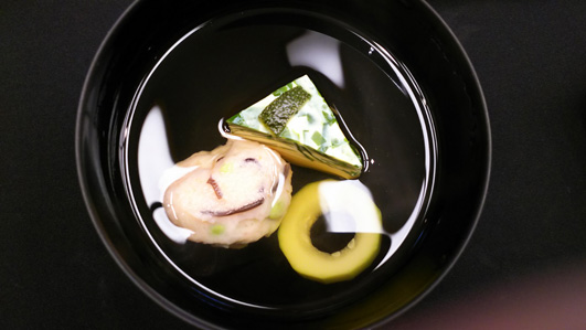 (海老のすり身に針竹の子、むき枝豆、木耳を混ぜ合わせた椀種)
