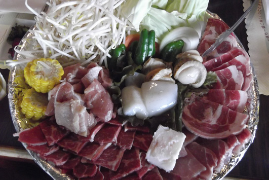 私が頂いたのは、牛肉・ラム肉・鶏肉・豚トロと野菜・シーフードのセットです。