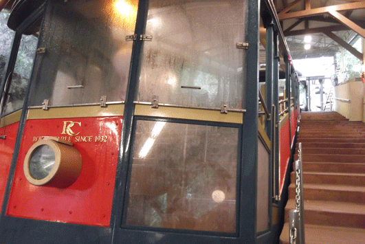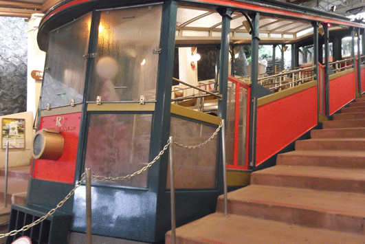 ケーブルカーは2つの車両がロープで繋がっていて、井戸のつるべのように一方の車両を引き上げると、もう一方の車両が下がってくるしくみになっています。