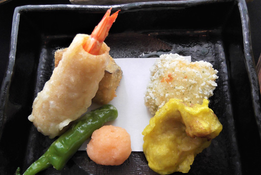 (海老に湯葉を巻き、揚げたもの。東寺とは湯葉の別名で京都の東寺で作られたことからこの名がある。)