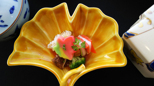 名残りの鱧と今から旬の小蕪、紅葉型の人参をあしらい、秋の味覚と見た目にも楽しんで頂ける一品です。
