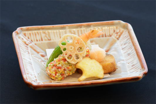 海老五色揚げ いちょう丸十 獅子唐