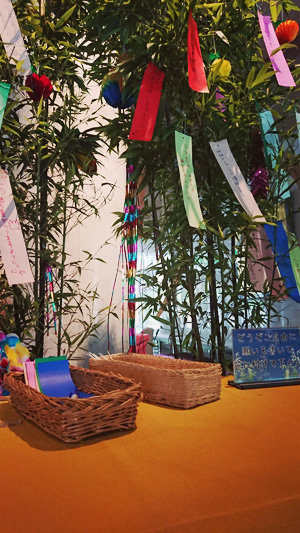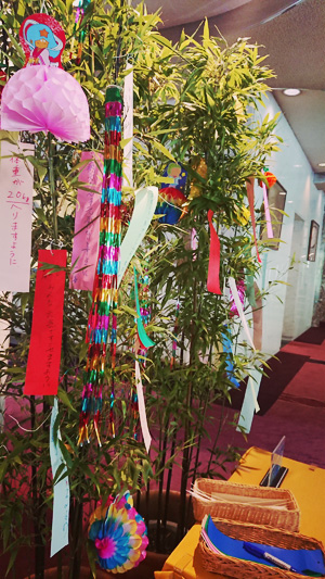 ただいま月光園 鴻朧館・游月山荘の両フロントにて、七夕の笹飾りを設置中です。さっそくお客様からたくさんの願い事を書いていただいております。