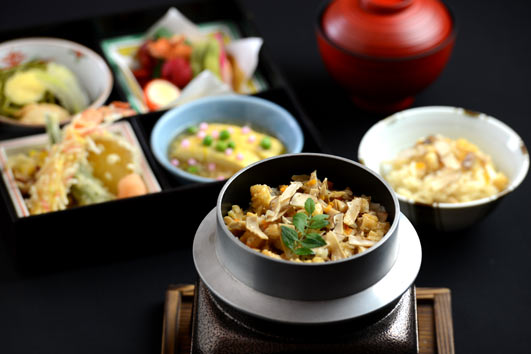 1番人気の箱盛膳のコースに秋の味覚『松茸の釜飯』が付いた
