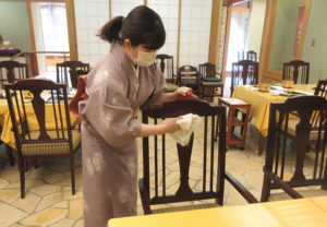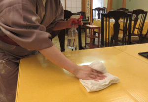 - テーブル、座椅子、座布団、お膳、運搬用機器等の消毒を実施しております。