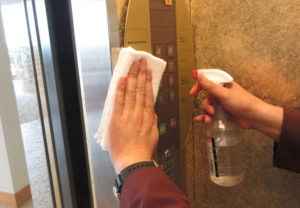 - 通常の清掃後に、不特定多数が触れる環境表面を、始業前、始業後に清拭消毒しております。ドアノブやエレベーターのボタン、階段の手すり、フロントデスクなどは、定期的にアルコール液で拭いております。