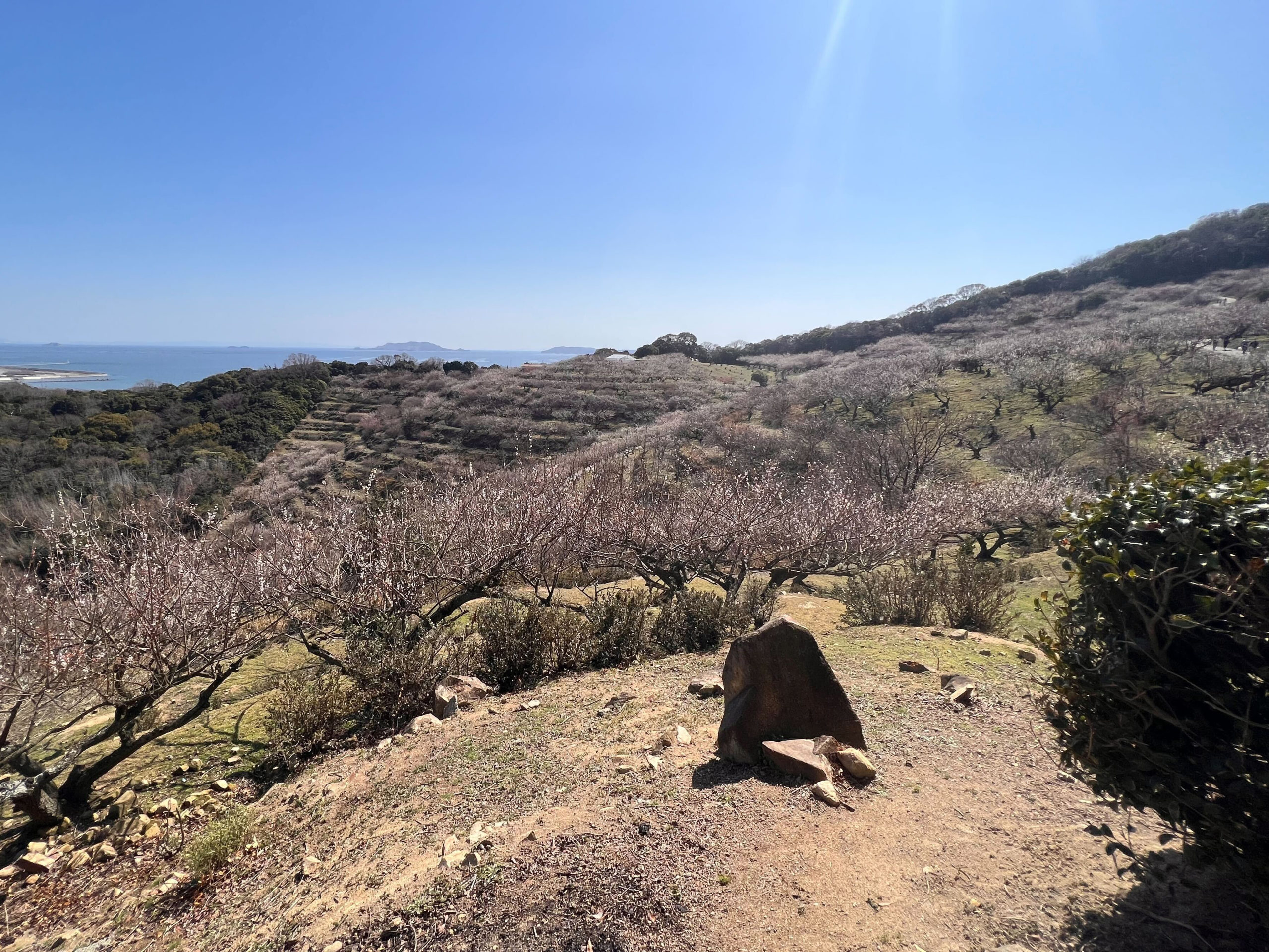 青い空と、瀬戸内海、そして瀬戸内海の島々と、非常に景観の良い梅林です。