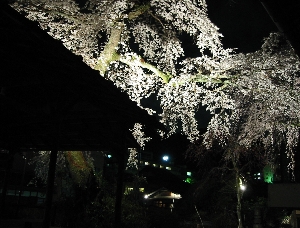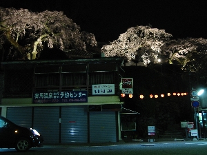 夜になるとこの辺りのお店も閉まり、派手な明かりが回りに無いのでライトアップされた糸桜が際立ちます。