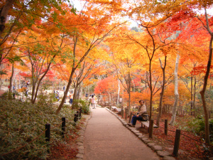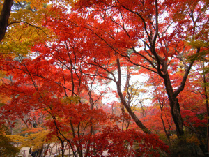 関西でも有数の紅葉の見所とされるだけあって、見事に木々が色づいていました。 思わず写真を撮りたくなるようなポイントがそこかしこにあって、写真を撮るだけでも飽きないものがあります。 黄色に色づいた木もあるのですが、紅に色づいた木の方が多く、非常に色鮮やかです。