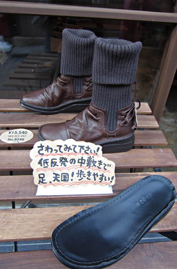 有馬の急な坂の多い道でも、膝や足に大きな負荷をかけることなく歩ける靴がこのお店では売られています。