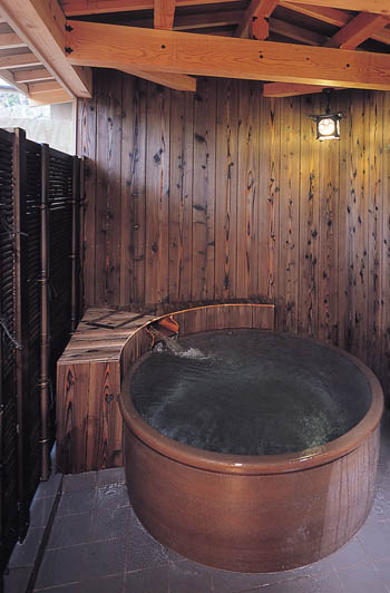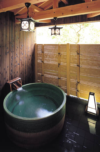 信楽焼で造られた浴槽に浸かって、渓流の音を楽しむ癒しの一時を堪能できます。