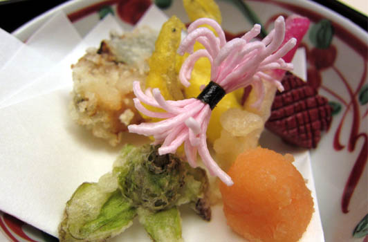 白魚の金麩羅に、赤蒟蒻、百合根蓬団子が料理の色彩を引き立て。