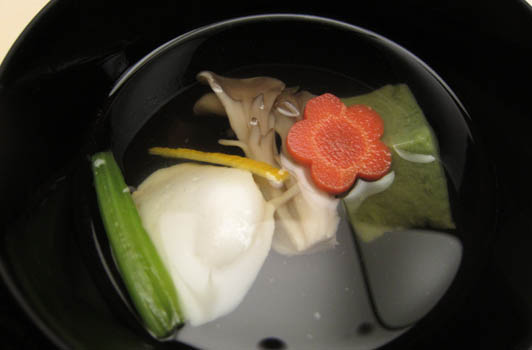 【煮物椀】 蛤進上・よもぎ豆冨・舞茸・梅花人参・のし青菜軸・香り柚子