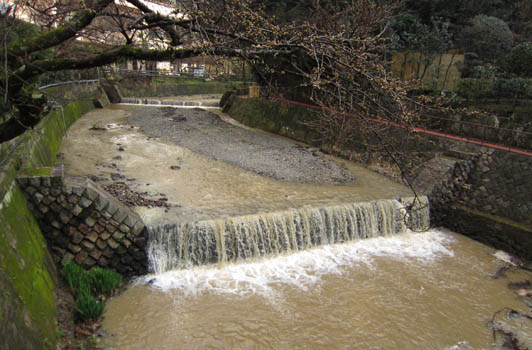 激しい雨により、現在は川も荒れています。