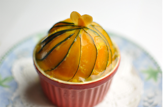 こちらのケーキの名前、『ダブル』とは、かぼちゃのスフレケーキの上にかぼちゃのムースを組み合わせたケーキを意味しており、
