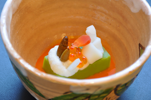 綺麗なうぐいす色のお豆富に、橙色のいくら・人参・雲丹ソースの色合いが春の訪れを感じさせます.*.。.:*・゚