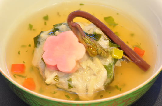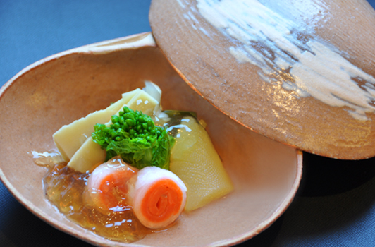 【蓋 物】 若竹蒸し 鰆 すずなおこわ 梅麩 鉤(かぎ)わらび 霰(あられ)パプリカ 木の芽あん