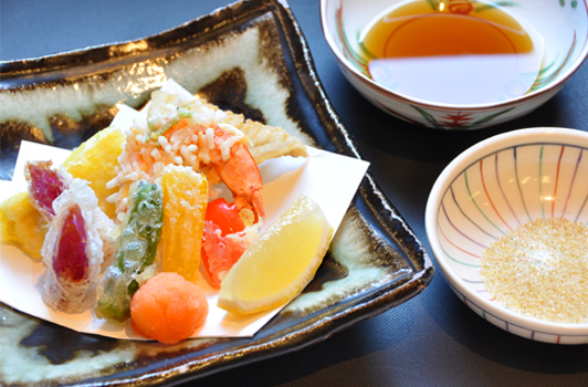 天婦羅つゆとカレー塩、2種類のお味をお楽しみ頂けます。
