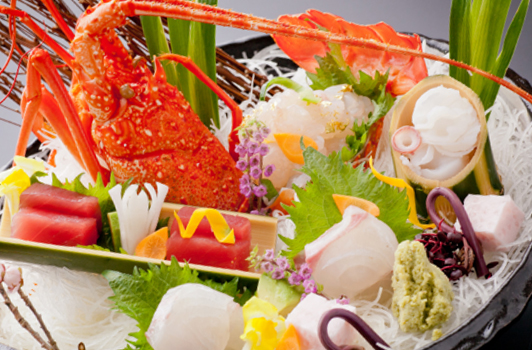 【画像:伊勢海老姿造り金粉掛け、明石鯛 他】