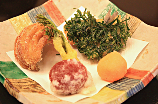 【油 物】 油目カレー風味 鱚若草揚げ 筍海老衣 他