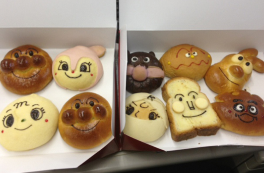 見てください、アンパンマンに登場するキャラクターの顔をしたパンですよ!