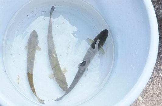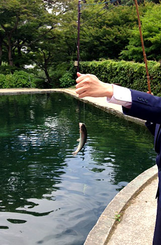 糸を垂らすと、水に浸かる前から子どものマスがすごい勢いで寄ってくる寄ってくる(笑)
