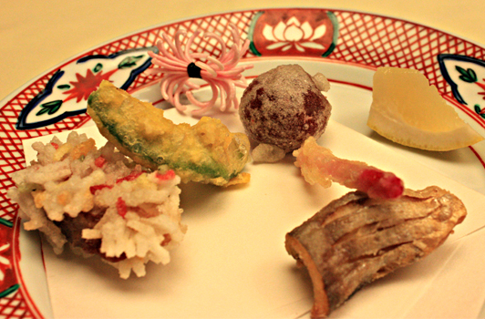 【揚 物】 鴨ロース豊年(ほうねん)揚げ 赤梅白扇(あかうめはくせん) 端かみ生姜 他