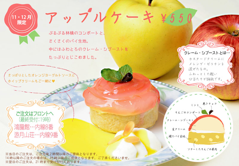 こちらの「季節のケーキ」はご当日19時までご注文を承っており、お部屋にもご案内をご用意しております。